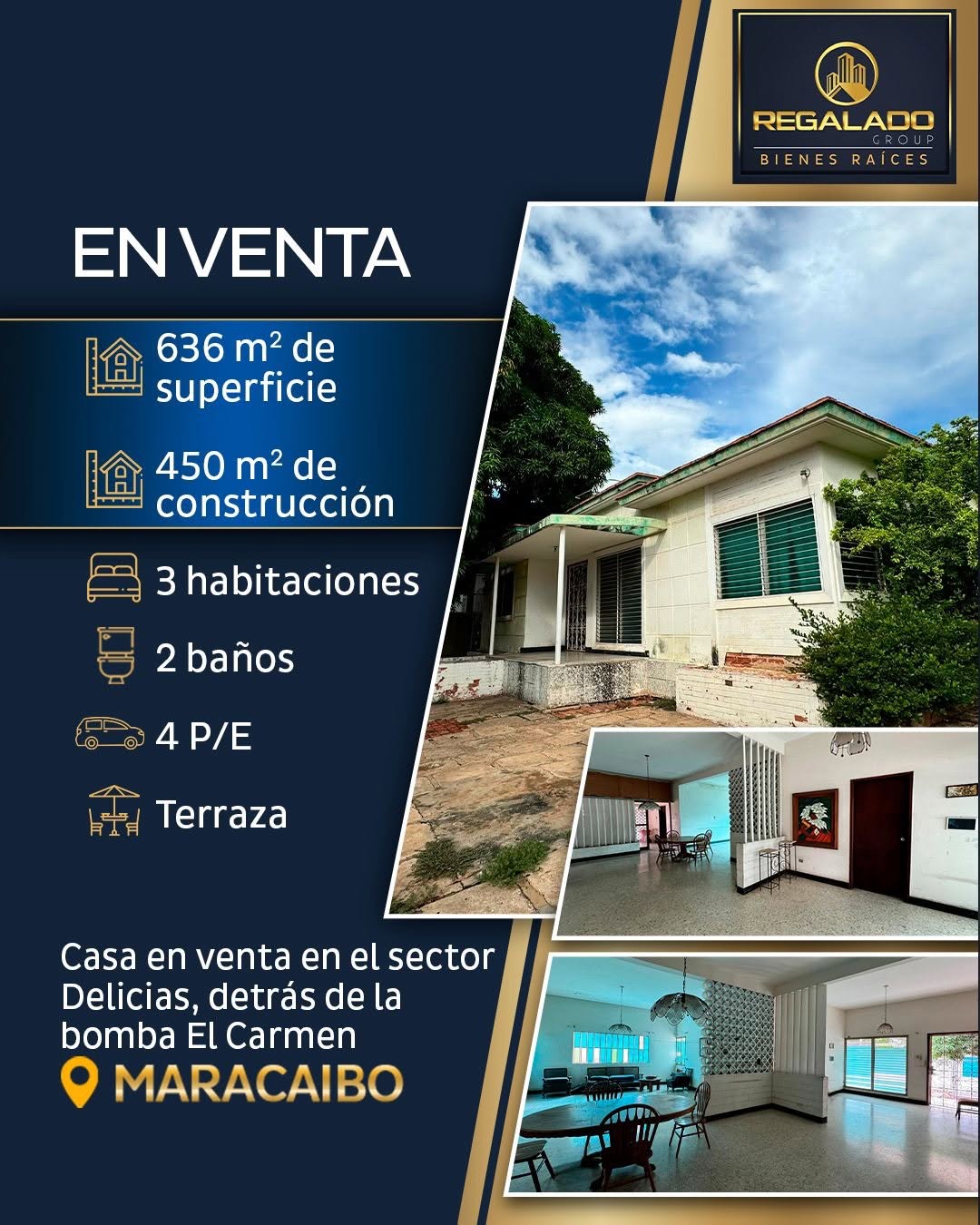 Casa comercial en venta en el sector Las Delicias, detrás de la bomba El Carmen. Cuenta con recibidor, sala, comedor, cocina, 3 habitaciones, 2 baños, más habitación y baño de servicio. Pisos de granito, terraza, lavadero, patio trasero con sistema hidroneumático y 2 tanques de agua. Estacionamiento para 4 vehículos.