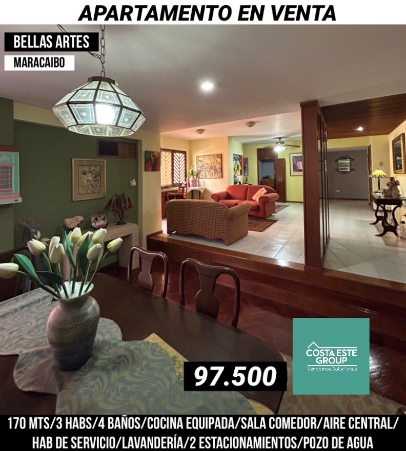 Nueva captación! APARTAMENTO EN VENTA EDIFICIO MANATIARE SECTOR BELLAS ARTES #maracaibo Para remodelar a gusto del comprador y ubicado en zona exclusiva de la ciudad Piso medio y uno por piso 170 mts 1 aire central de 5 toneladas en área social Comedor a desnivel con pisos de parket Sala amoblada y con pisos de cerámica Baño social Cocina equipada con gabinetes de formica, para adecuar a gusto Área de lavandería equipada Hab de servicio con baño Hab principal amplia con baño privado remodelado Piso de cerámica Aire split de 18.000 BTU 2 habitaciones secundarias con closets amplios, pisos de parket y baño compartido Closet en pasillo Se vende amoblado El edificio cuenta con: -Pozo de agua -2 ascensores -Ámplio lobby -Patio con área social -Vigilancia 24/7 ▫️Precio:97.500 Te escuchamos Mariela Nava Asesora COSTA ESTE GROUP 424-6220336📲 #apartamentosenventa #inversióninmobiliaria #inmueblesmaracaibo