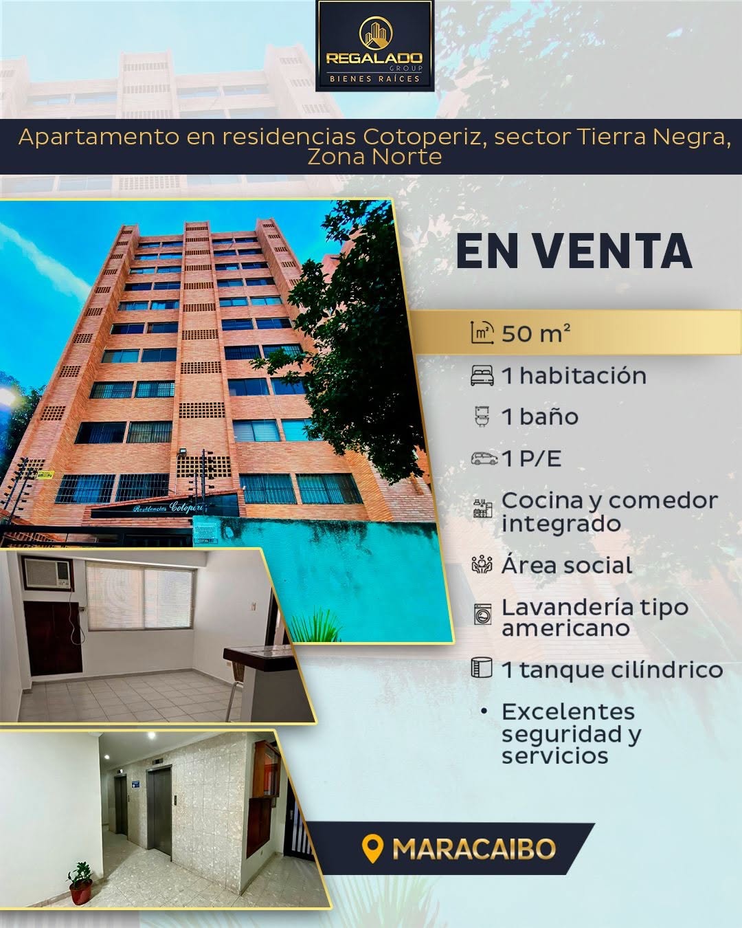 En venta apartamento en Residencias Cotoperiz, sector Tierra Negra. 📌 Consta de 50 m². Consta de: - 1 habitación - 1 sala sanitaria - Cocina y comedor integrado - Área social - Lavandería tipo americano - 2 lockers - 1 tanque cilíndrico - 1 puesto de estacionamiento Bondades de la residencia: - Seguridad 24/7 - Portón eléctrico - Cámaras de seguridad - Servicios eficientes de agua y gas - Excelente ubicación y condominio Yisel Portillo @yiselregaladogroup +58 424-6538948 Carlos Aldea @aldeahillregaladogroup +58 412-2453479