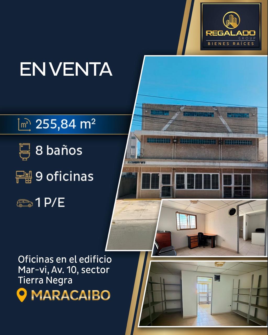 Oficinas en venta en el edificio Mar-vi, sector Tierra Negra, Avenida 10. Cuenta con 255.84 m², distribuidos en 9 oficinas, 8 baños y 1 puesto de estacionamiento.
